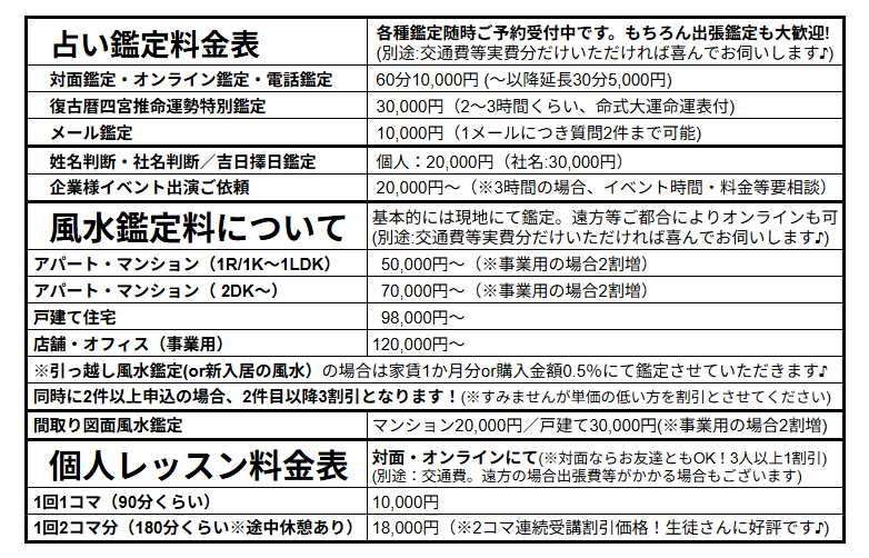 (風水鑑定・図面鑑定・占い鑑定・個人レッスンいずれも対面・オンラインでもOK!)